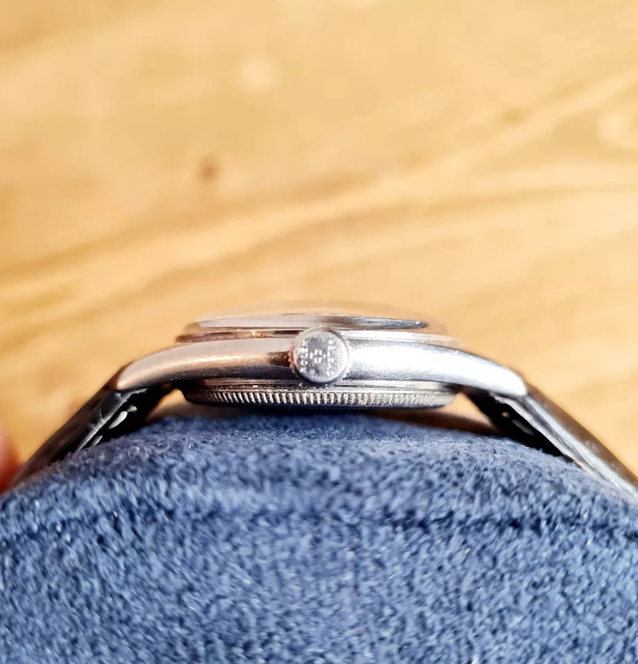 A Rolex Oyster Shock resisting watch with a significant date and a rare dial with the gilt numerals so very collectable. The watch has just been serviced and is supplied with a new leather strap.